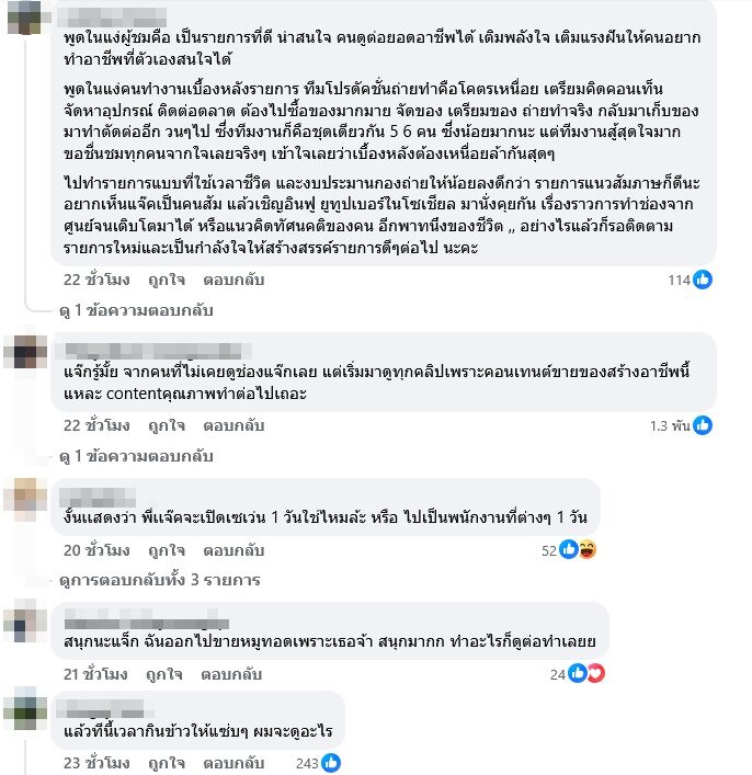 - น่าจะทำต่อนะคะ เป็นรายการที่สามารถสร้างจุดประกายให้คนคนนึงได้มีอาชีพ เราและครอบครัวเป็นกำลังใจให้ค่ะแจ๊ค