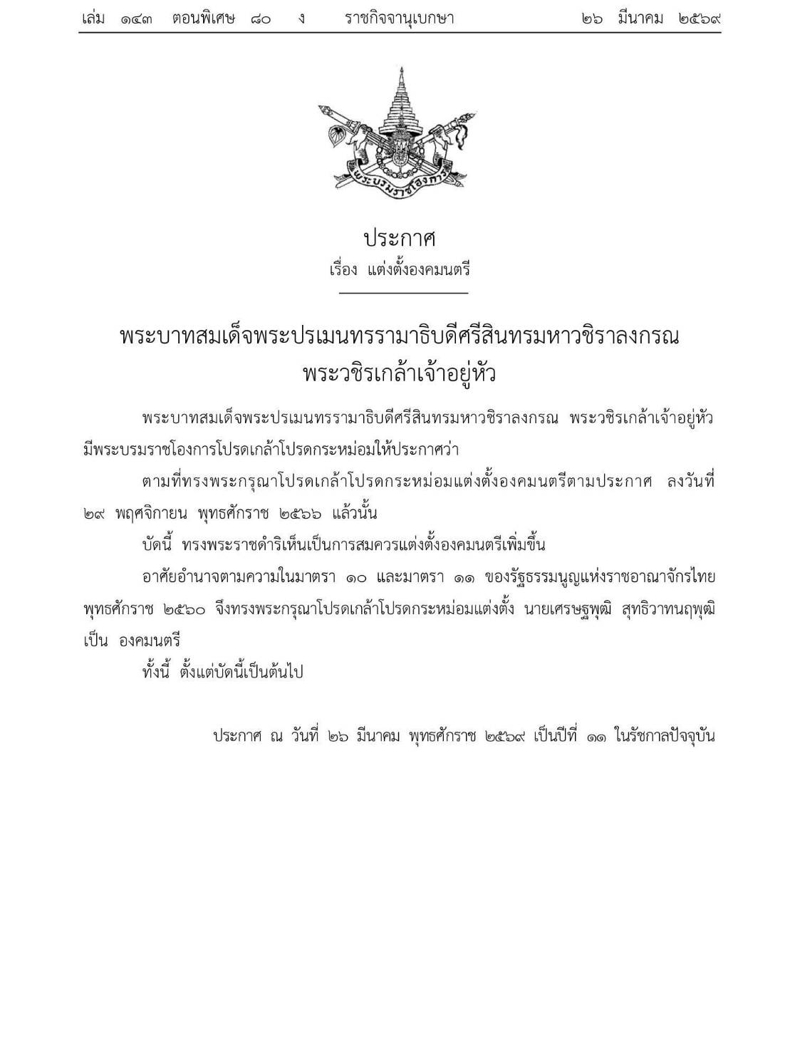 ทั้งนี้ ประกาศดังกล่าวได้กระทำขึ้น ณ วันที่ 26 มีนาคม พุทธศักราช 2569 ซึ่งนับเป็นปีที่ 11 ในรัชกาลปัจจุบัน