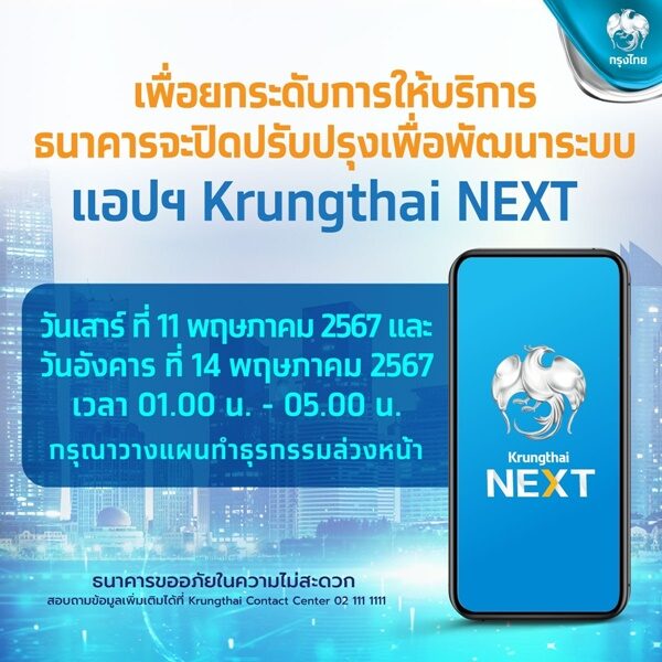 - ปิดปรับปรุงระบบ Krungthai Next เวลา 01:00-05:00 น.