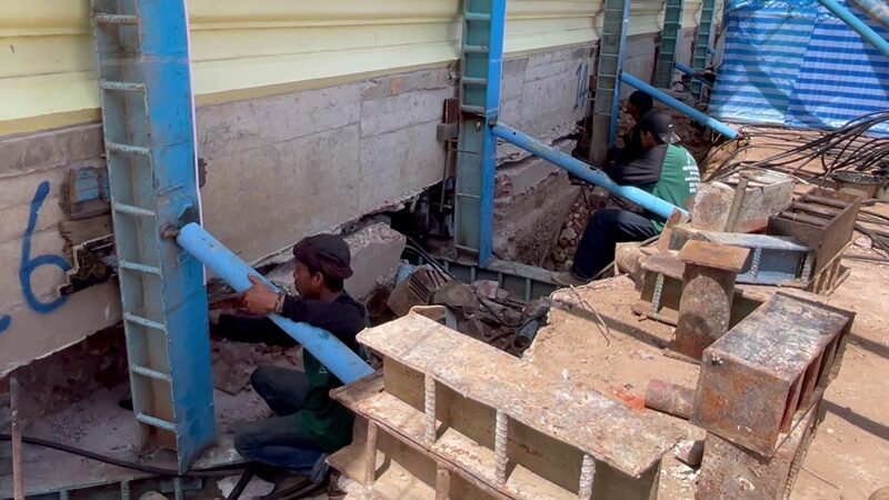 หนีน้ำท่วม วัดกำแพงเร่งยกอุโบสถให้สูง 4 เมตร น้ำหนัก 1 ตัน จะได้ไม่ต้องซ่อมทุกปี ช่างเผยใช้คาน 48 ตัว ยกครั้งละ 1 เซนติเมตร