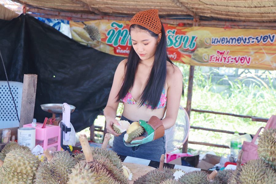 แซ่บทะลุเปลือก 'น้องอั้ม' แม่ค้าทุเรียนเซ็กซี่ ขายหมอนทองลูกใหญ่ ยืนแกะริมถนน