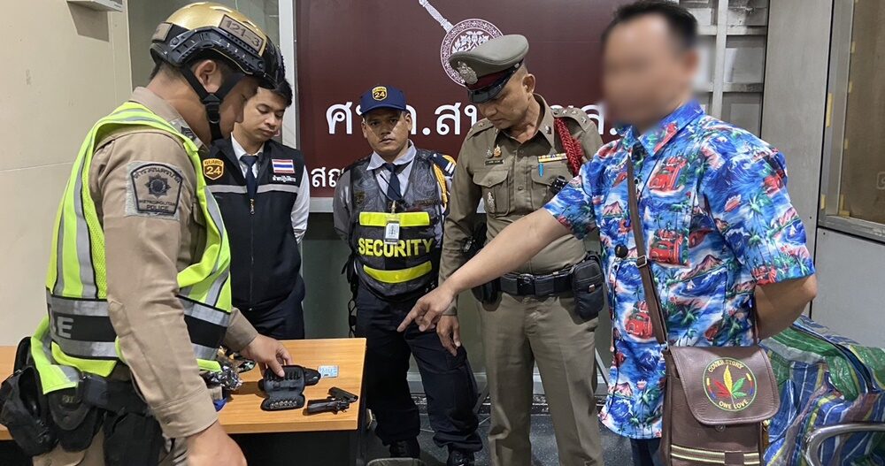 รวบคาหมอชิต! หนุ่มพิรุธออก จับเข้าเครื่องสแกนโลหะดังตี้ดๆ ค้นเจอปืนไทยประดิษฐ์ .38 พร้อมกระสุน รีบซื้อมาจากเพื่อน กระบอกละ 7,000 บาท