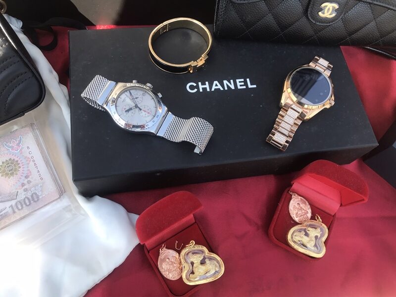 7.นาฬิกา 4 เรือน มูลค่าประมาณ 250,000 บาท 8.เปี่ยเซี๊ยะ ลักษณะคล้ายทองคำ 2 อัน มูลค่าประมาณ 35,000 บาท 9.แหวนฝั่งเพชร 1 วง มูลค่าประมาณ 100,000 บาท และ 10.ลำโพง มาแชล 1 อัน มูลค่าประมาณ 15,000 บาท
