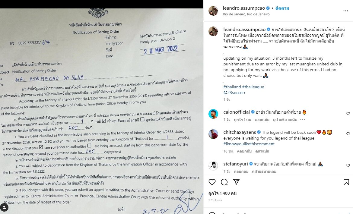 'เลอันโดร อัสซัมเซา' แข้งดังบราซิล อีกหนึ่งตำนานไทยลีก โพสต์โดนห้ามเข้าไทย เผยสาเหตุ