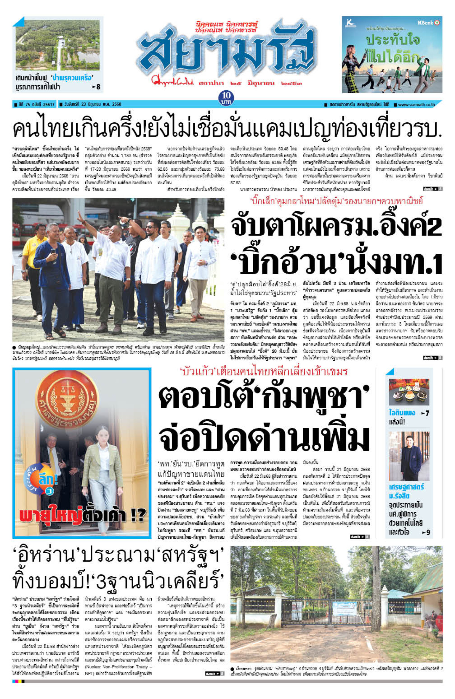 หน้า 1 หนังสือพิมพ์สยามรัฐรายวัน ฉบับวันจันทร์ที่ 22 มิถุนายน 2568