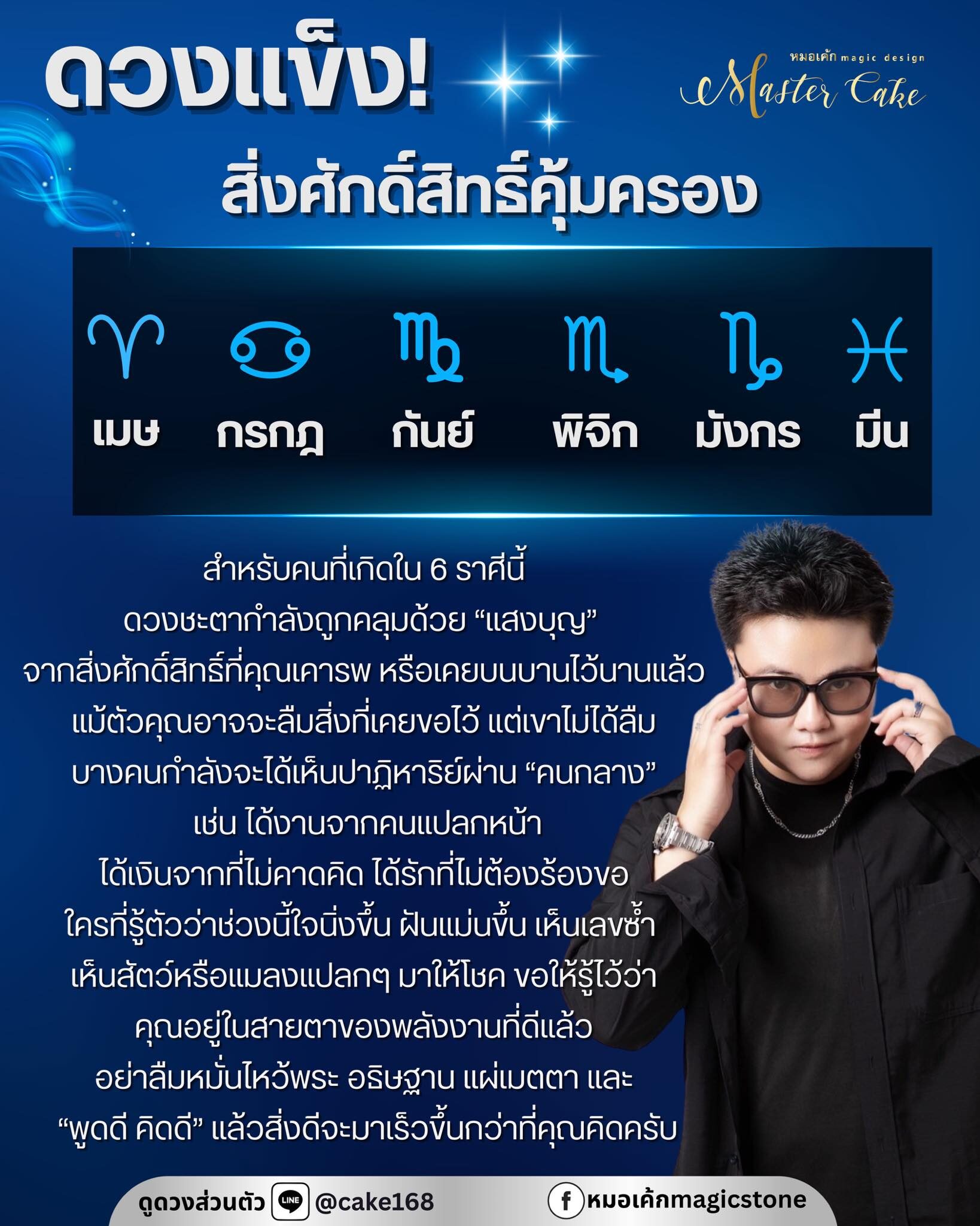 หมอเค้กMagic stone เผยถึงดวงชะตาราศี ดวงแข็ง สิ่งศักดิ์สิทธิ์คุ้มครอง ดวงถูกคลุมด้วยแสงบุญจากสิ่งศักดิ์สิทธิ์ที่เคารพ หรือเคยบนบานไว้นานแล้ว บางคนกำลังจะได้เห็นปาฏิหาริย์ผ่านคนกลาง เช่น ได้งานจากคนแปลกหน้า ได้เงินจากที่ไม่คาดคิด ได้รักที่ไม่ต้องร้องขอ ใครที่รู้ตัวว่าช่วงนี้ใจนิ่งขึ้น ฝันแม่นขึ้น เห็นเลขซ้ำ เห็นสัตว์หรือแมลงแปลกๆ มาให้โชค ขอให้รู้ไว้ว่า คุณอยู่ในสายตาของพลังงานที่ดีแล้ว อย่าลืมหมั่นไหว้พระ อธิษฐาน แผ่เมตตา