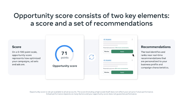 เครื่องมือปรับประสิทธิภาพแคมเปญล่าสุดจาก Meta ที่ชื่อว่า ‘คะแนนโอกาส’ เป็นเครื่องมือที่ให้คำแนะนำเพื่อปรับปรุงประสิทธิภาพแคมเปญในแบบเรียลไทม์ โดยอิงจากอัลกอริทึมของแมชชีนเลิร์นนิ่งขั้นสูงและการทดสอบกับ ผู้ลงโฆษณาหลายพันราย โดยผู้ใช้งานกลุ่มแรกพบว่าค่าผลลัพธ์เฉลี่ยต่อการกระทำลดลงถึง 12%