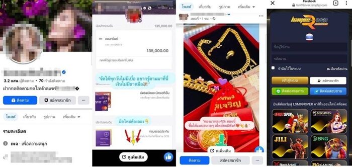 หรือโพสต์ภาพสร้อยทองคำ และข้อความว่า "ทองบาทละ 40k ตอนนี้ ซื้อได้แบบสบาย ๆ สไตล์คนมีตังค์" เป็นต้น พร้อมทั้งแนบลิงก์เว็บไซต์ทั้งนี้ เมื่อคลิกเข้าไปแล้วปรากฏว่าเป็นเว็บไซต์พนันออนไลน์อย่างชัดเจน