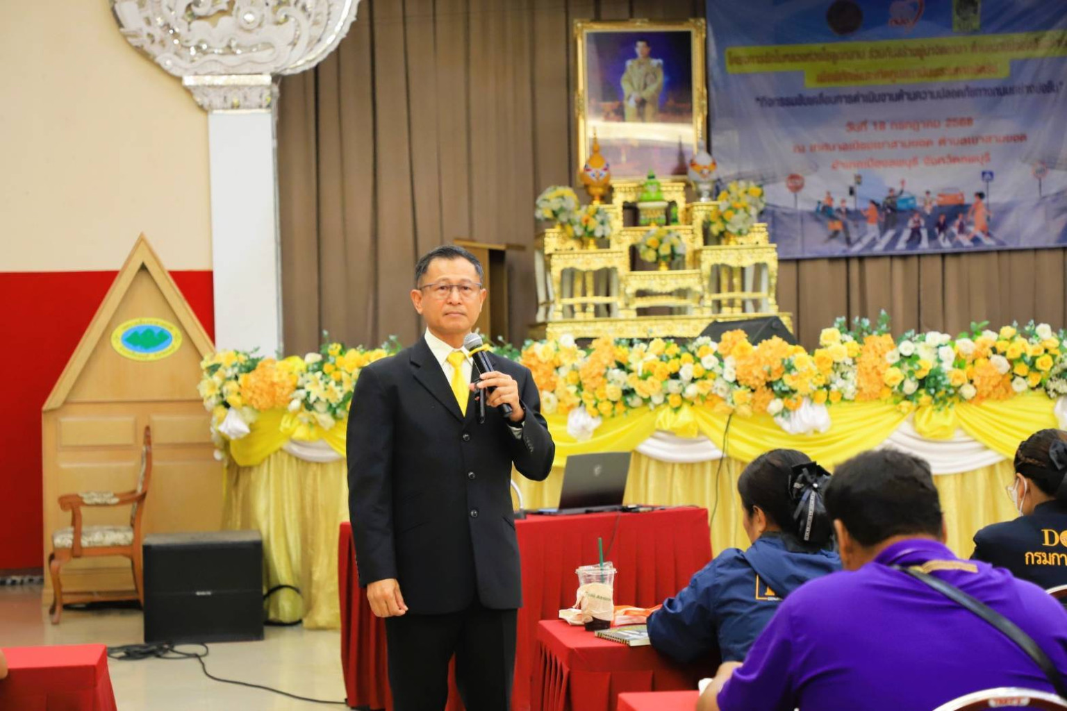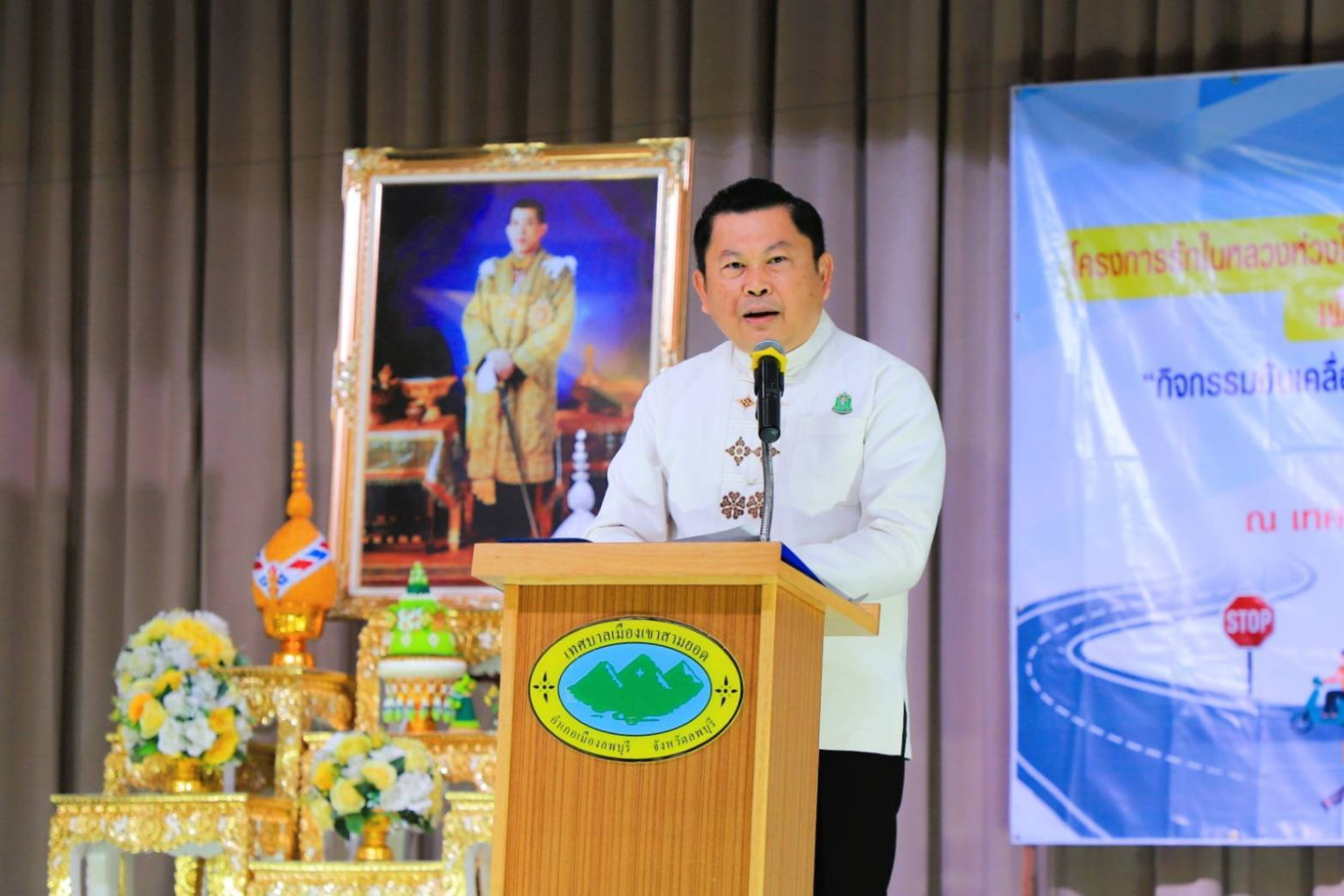 วันที่ 18 กรกฎาคม 2568 ที่หอประชุมเทศบาลเมืองเขาสามยอด ตำบลเขาสามยอด อำเภอเมืองลพบุรี จังหวัดลพบุรี นายปรัชญา เปปะตัง รองผู้ว่าราชการจังหวัดลพบุรี เป็นประธานเปิดกิจกรรมขับเคลื่อนการดำเนินงานด้านความปลอดภัยทางถนนอย่างยั่งยืน ภายใต้โครงการรักในหลวงห่วงใยลูกหลานร่วมกันสร้างผู้นำจิตอาสาด้านความปลอดภัยอย่างยั่งยืนเพื่อพิทักษ์และเทิดทูนสถาบันพระมหากษัตริย์ โดยมี นายวิรพัฒน์ อ่อนสุระทุม หัวหน้าสำนักงานป้องกันและบรรเทาสาธารณภัยจังหวัดลพบุรี พร้อมด้วย หัวหน้าส่วนราชการ คณะกรรมการศูนย์ปฏิบัติการความปลอดภัยทางถนนระดับอำเภอ คณะกรรมการศูนย์ปฏิบัติการความปลอดภัยทางถนนองค์กรปกครองส่วนท้องถิ่นและผู้นำท้องที่จาก 6 อำเภอ เข้าร่วม จำนวน 300 คน ทั้งนี้เพื่อให้ความรู้ความเข้าใจเกี่ยวกับอุบัติเหตุทางถนนที่เกิดขึ้นอธิบายโดยอาศัยแบบจำลองอุบัติเหตุที่ได้รับการยอมรับอย่างเป็นสากลทำให้ผู้เข้ารับการอบรมได้มีมุมมองใหม่ที่ถูกต้องเกี่ยวกับสาเหตุและปัจจัยเกื้อหนุนของอุบัติเหตุที่เกิดขึ้นนำไปสู่การป้องกันและแก้ไขปัญหาอุบัติเหตุทางถนนอย่างมีประสิทธิผล นำไปพัฒนาเป็นทักษะและทัศนคติที่ถูกต้อง