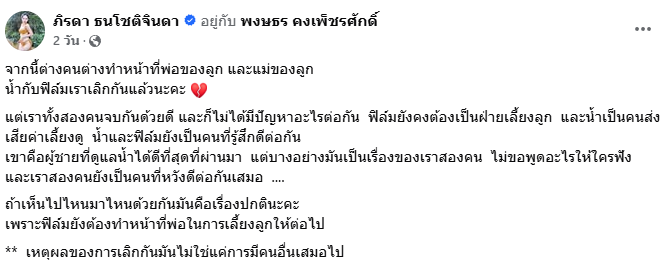 "จากนี้ต่างคนต่างทำหน้าที่พ่อของลูก และแม่ของลูก น้ำกับฟิล์ม เราเลิกกันแล้วนะคะ แต่เราทั้งสองคนจบกันด้วยดี และก็ไม่ได้มีปัญหาอะไรต่อกัน ฟิล์มยังคงต้องเป็นฝ่ายเลี้ยงลูก และน้ำเป็นคนส่งเสียค่าเลี้ยงดู น้ำและฟิล์มยังเป็นคนที่รู้สึกดีต่อกัน