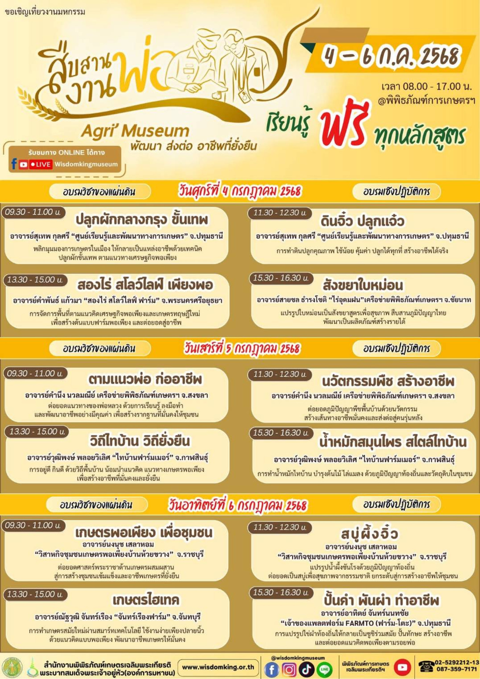 สอบถามรายละเอียดเพิ่มเติม โทร. 02-529-2212-13, 087-359-7171 คลิกดูรายละเอียดได้ที่ www.wisdomking.or.th หรือ Facebook พิพิธภัณฑ์การเกษตรฯ