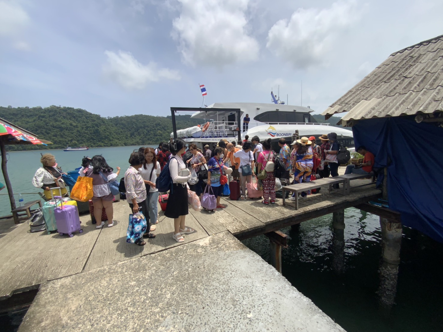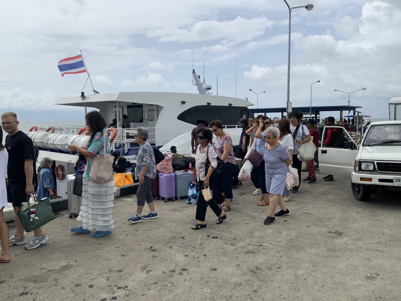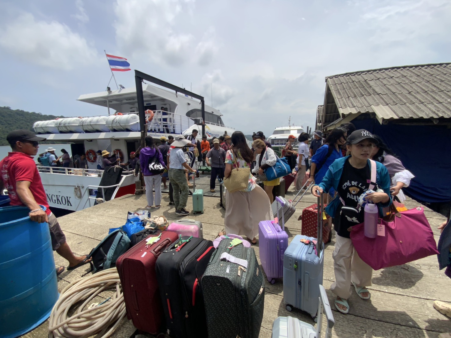 ที่ท่าเรือแหลมศอก อ.เมือง จ.ตราด เวลา 10.30 น.วันที่ 28 มิถุนายน 2568 นักท่องเที่ยวยังเดินทางท่องเที่ยวไปยังเกาะกูด โดยเรือโดยสารของบริษัทบุญศิริเรือเร็วจำกัด และของบริษัท เสือดำโกร จำกัด จำนวนกว่า 200 คน และยังมีเที่ยวเดินเรือของ 2 บริษัท บริการอยู่จนถึงช่วงบ่ายวันนี้