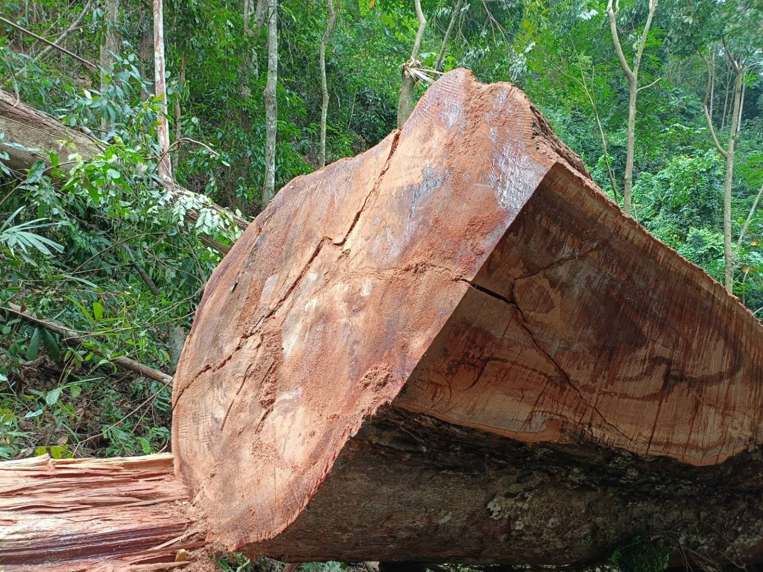 หลังจากเข้าตรวจสอบพบ มีการตัดโค่นไม้ซุงขนาดใหญ่หลายท่อน แบ่งออกเป็น 2 แปลง แปลงแรกมีการตัดโค่นไม้ไข่เขียว 4 ต้น ตัดแบ่งเป็นท่อนได้มากถึง 17 ท่อน ไม้ยูง 1 ต้น ตัดแบ่งซุงออกเป็น 5 ท่อน แปลงนี้พบว่ามีการนำเอกสารสิทธิ์ชนิด นส.3 มีผู้ครอบครอง 2 รายมาแสดง แต่พบว่ามีความทับซ้อนอยู่ในเขตป่าไม้ถาวร เช่นเดียวกับอีกแปลงพบไม้ยางนาขนาดใหญ่ 1 ต้นมีเส้นรอบวงถึง 520 ซม. ท่อนซุงยาว 23 เมตร พบพิกัดอยู่ในเขตป่าไม้ถาวร แต่มีการอ้างเอกสารสิทธิ์ซึ่งยังรอการนำมาแสดงของผู้ครอบครอง สำหรับพื้นที่ป่าถาวรในย่านนี้อยู่ในความดูแลของกรมป่าไม้