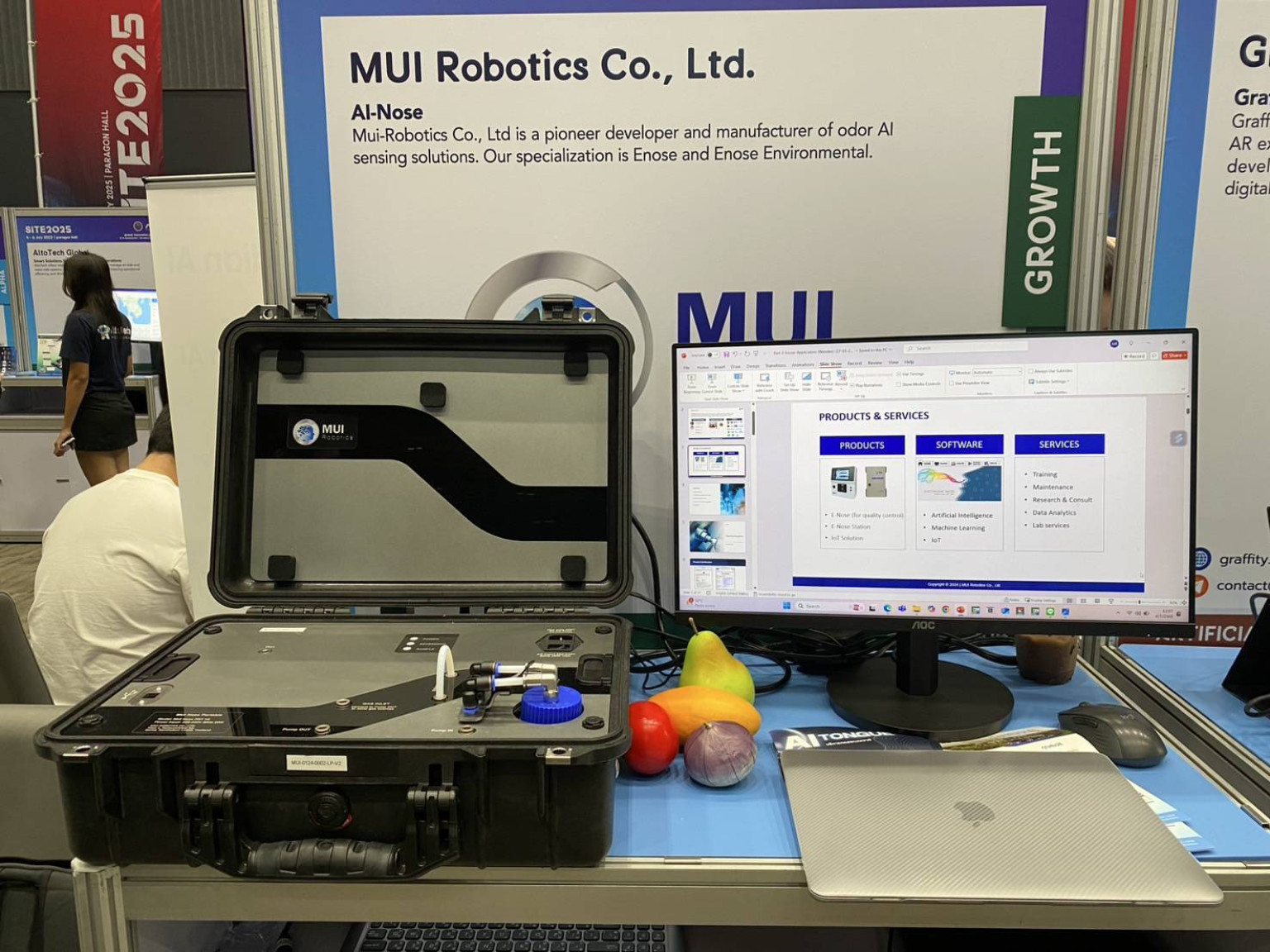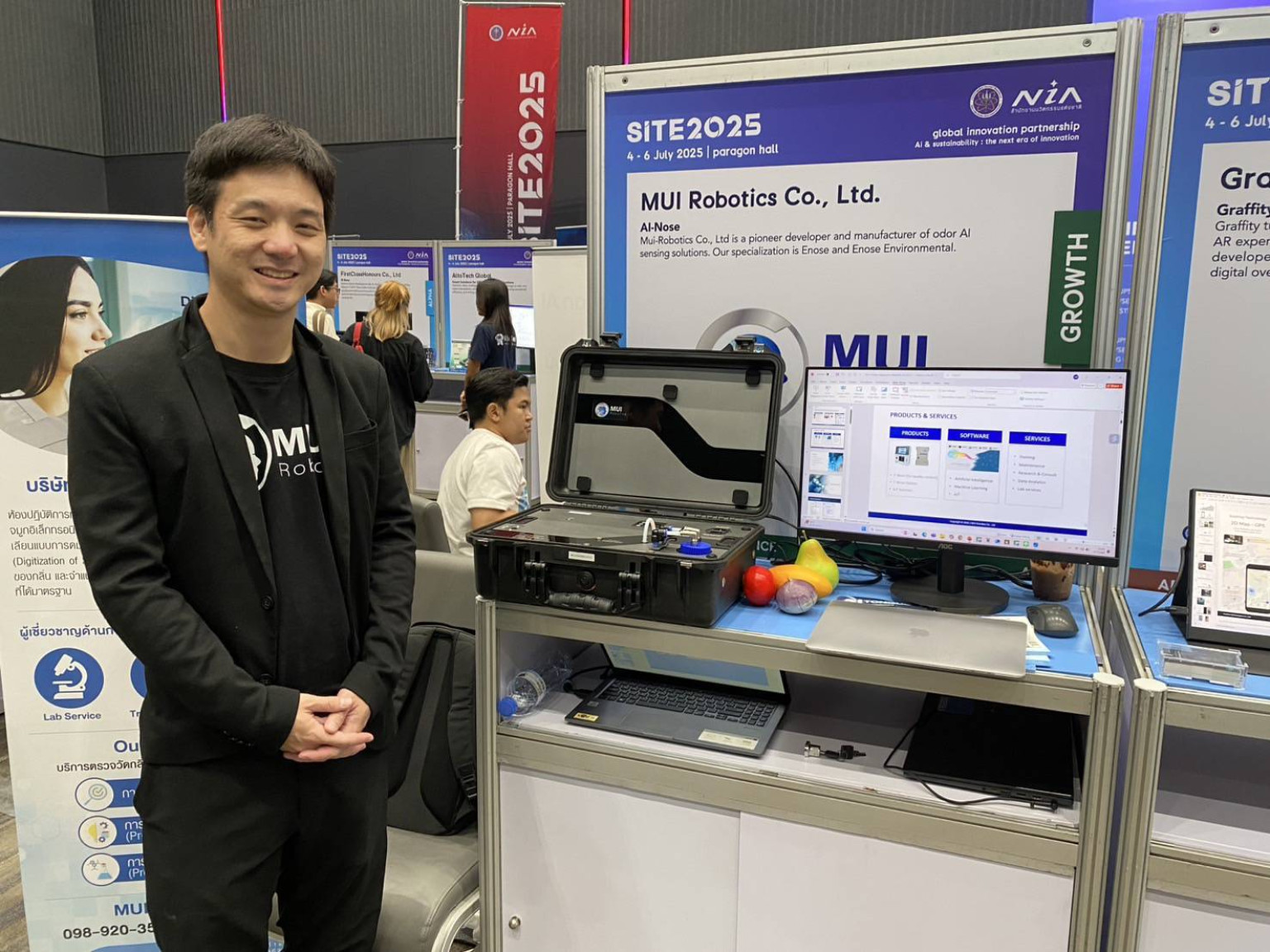 ในงาน Startup x Innovation Thailand Expo 2025 หรือ SITE 2025 ที่จัดขึ้นภายใต้แนวคิด “Global Innovation Partnership – AI & Sustainability: The Next Era of Innovation” โดยสำนักงานนวัตกรรมแห่งชาติหรือ NIA ที่พารากอน ฮอลล์ หนึ่งที่ในผลงานนวัตกรรมที่นำมาจัดแสดงและได้รับความสนใจจากผู้เข้าชมงานคือ Electronic Nose หรือ E-nose เทคโนโลยีตรวจวัดกลิ่น-อากาศแบบเรียลไทม์ของบริษัท เอ็มยูไอ โรบอติกส์ จำกัด ที่สามารถแก้ปัญหากลิ่นไม่พึงประสงค์, มลพิษอากาศ, สารเคมี VOC, NH₃, H₂S หรือฝุ่น PM2.5 ได้ด้วยด้วยเทคโนโลยี E-nose และ AI