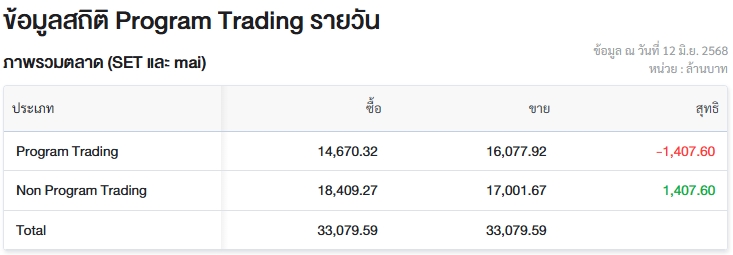 อัพเดต 12 มิ.ย. เวลา 11.50 น. • เผยแพร่ 12 มิ.ย. เวลา 11.50 น. • ข่าวหุ้นธุรกิจออนไลน์ผู้สื่อข่าวรายงานว่า วันนี้ (12 มิ.ย.68) ตลาดหลักทรัพย์แห่งประเทศไทย (ตลท.) เปิดเผยข้อมูลซื้อขายรายวันผ่าน Program Trading หรือ “โปรแกรมโรบอทเทรดดิ้ง” มีมูลค่าซื้อจำนวน 14,670.32 ล้านบาท และมูลค่าขายจำนวน 16,077.92 ล้านบาท เท่ากับขายสุทธิ 1,407.60 ล้านบาท