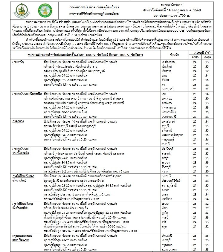 วันที่ 14 ก.ค.2568กรมอุตุนิยมวิทยา พยากรณ์อากาศ 24 ชั่วโมงข้างหน้า ประเทศไทยยังคงมีฝนฟ้าคะนองและมีฝนตกหนักบางแห่ง ขอให้ประชาชนในบริเวณดังกล่าว โดยเฉพาะบริเวณจังหวัด เชียงราย พะเยา น่าน หนองคาย บึงกาฬ อุดรธานี สกลนคร นครพนม และตราด ระวังอันตรายจากฝนตกหนักและฝนที่ตกสะสม ซึ่งอาจทำให้เกิดน้ำท่วมฉับพลัน น้ำป่าไหลหลาก โดยเฉพาะพื้นที่ลาดเชิงเขาใกล้ทางน้ำไหลผ่านและพื้นที่ลุ่ม