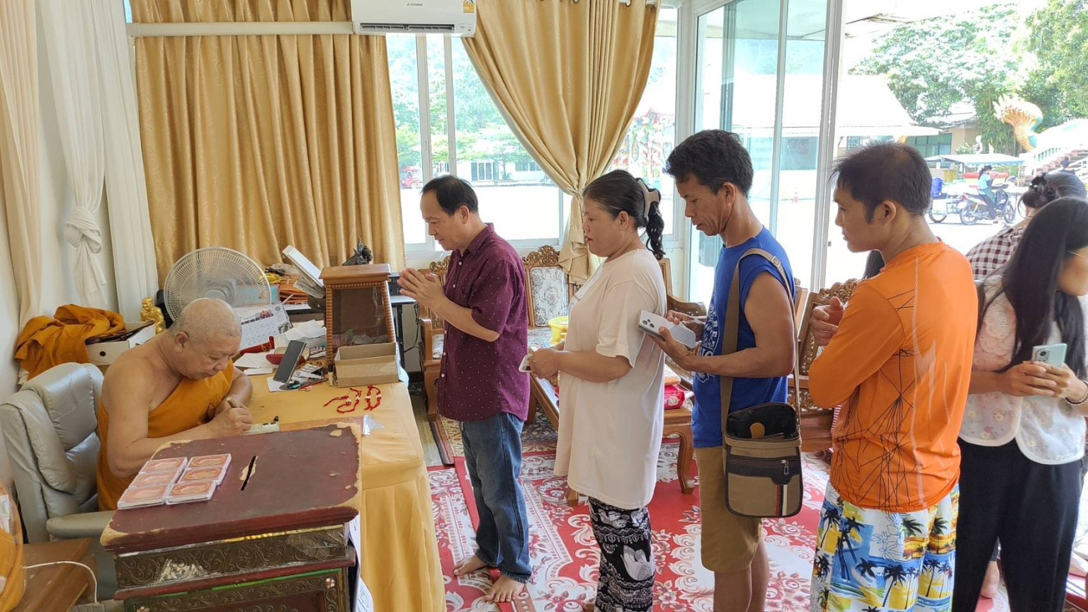 จากนั้นได้พากันเข้ามกราบไหว้พระครูธรรมธร ณรงค์ ธิติโสภโน ( หลวงเตี่ย )มีบรรดาสายบุญที่มีความเชื่อในการเจิมจำนวนมากพากันเอาโทรศัพท์ กระเป๋าสตางค์มาให้หลวงเตี่ยได้เจิมลงยันต์มหาลาภเมตตามหานิยมซึ่งมีปัญหานักเสี่ยงโชคหลังจากเจิมมือแล้วก็พากันส่องเลขยังสาวคนนี้ที่เดินทางมาจากฉะเชิงเทรามากับเพื่อนๆพอเจิมฝ่ามือเสร็จเธอก็ไม่พลาดดูตัวเลขที่ฝ่ามือและบอกเพื่อนๆว่าได้เลข 58 ยิ่งใกล้วันหวยออกคนที่ชอบเสี่ยงโชคก็ไม่พลาดพากันดูเลขในมือของตนเองหลังจากเจิมเสร็จบางคนก็ตีเป็นเลข 95 บางคนก็เห็นเป็นเลขอื่นก็เป็นดวงใครดวงมันโชคใครโชคมันซึ่งหลายคนก็จะนำเอาตัวเลขที่เห็นกไปเสี่ยงโชคในงวดวันที่ 16 นี้