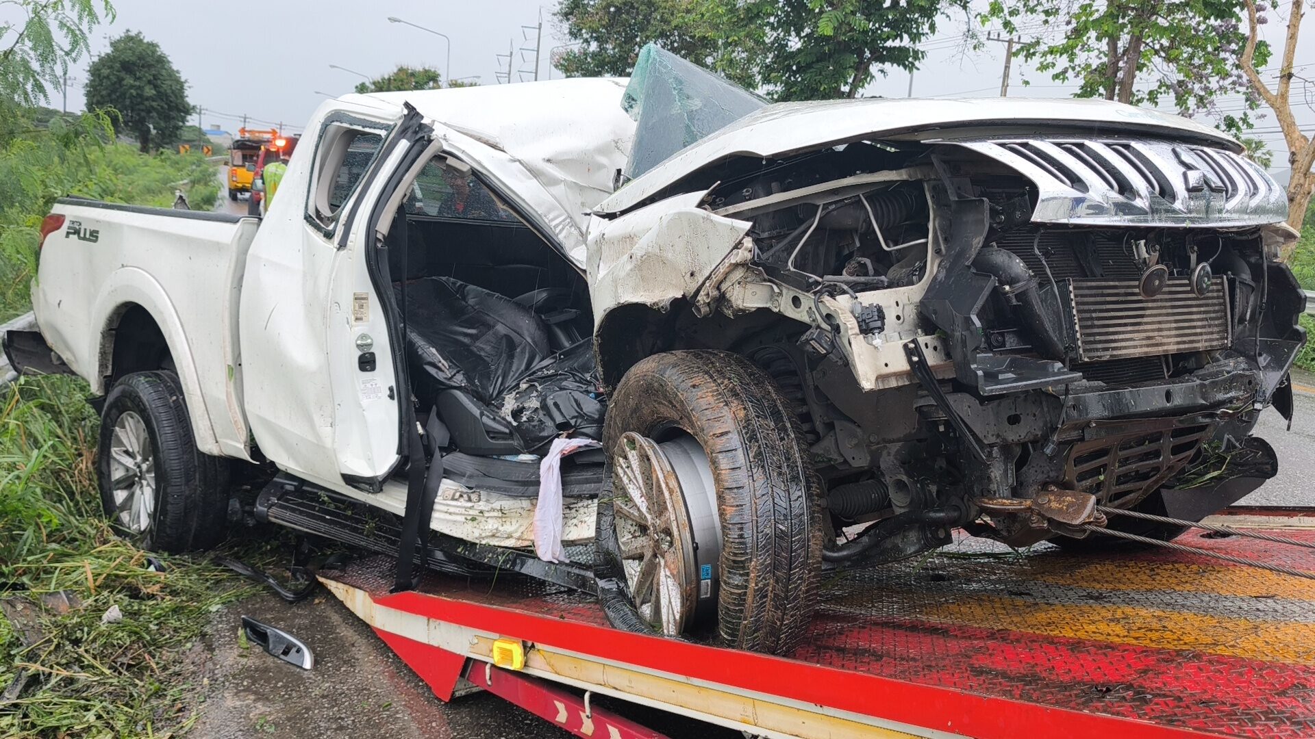 ตรวจสอบบริเวณตัวรถ เป็นรถกระบะ มิตซูบิชิ ไทรทัน สีขาว ทะเบียนกทม. รถกันชนด้านหน้า ล้อหน้าขวา และประตูฝั่งคนขับแตกยุบพังเสียหาย มีผู้โดยสารติดคาอยู่ภายในรถ 2 ราย เสียชีวิตคาที่ ณ จุดเกิดเหตุ เจ้าหน้าที่กู้ภัยต้องใช้อุปกรณ์เครื่องมือตัด-ถ่าง นำศพผู้เสียชีวิตทั้ง 2 รายออกมาจากซากรถ