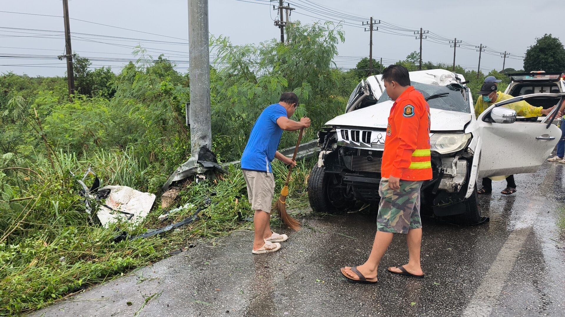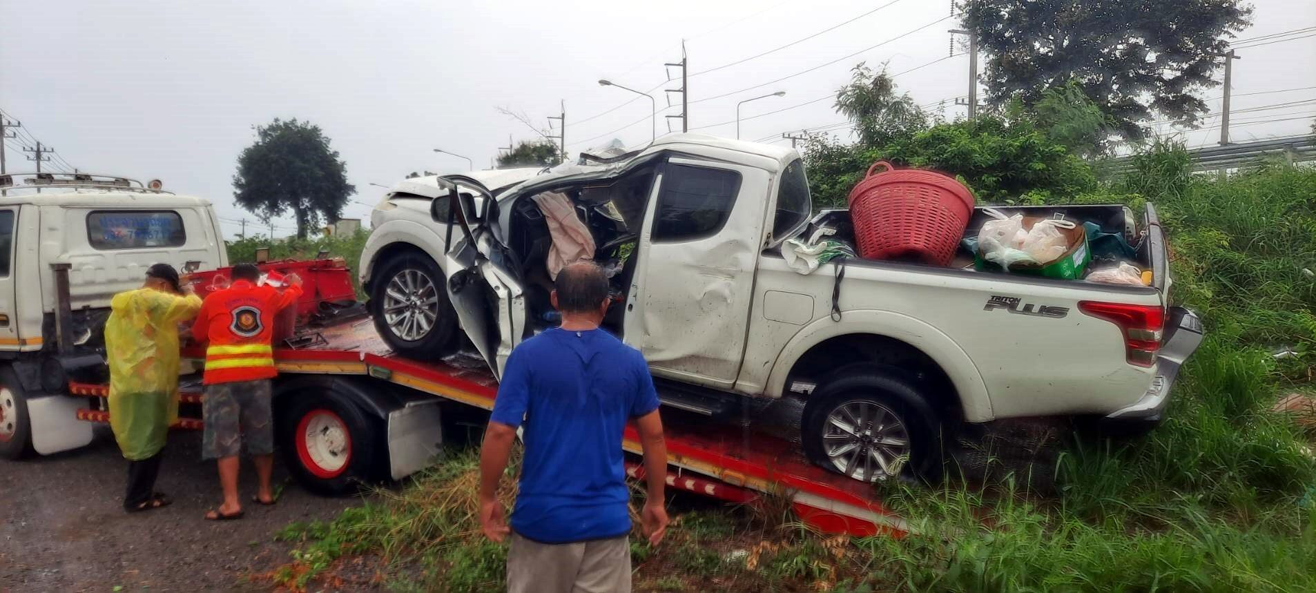 ผัวเมีย ขับกระบะฝ่าสายฝน แหกโค้งชนเสาเหล็กบอกจุดกลับรถ ดับ 2 ศพ
