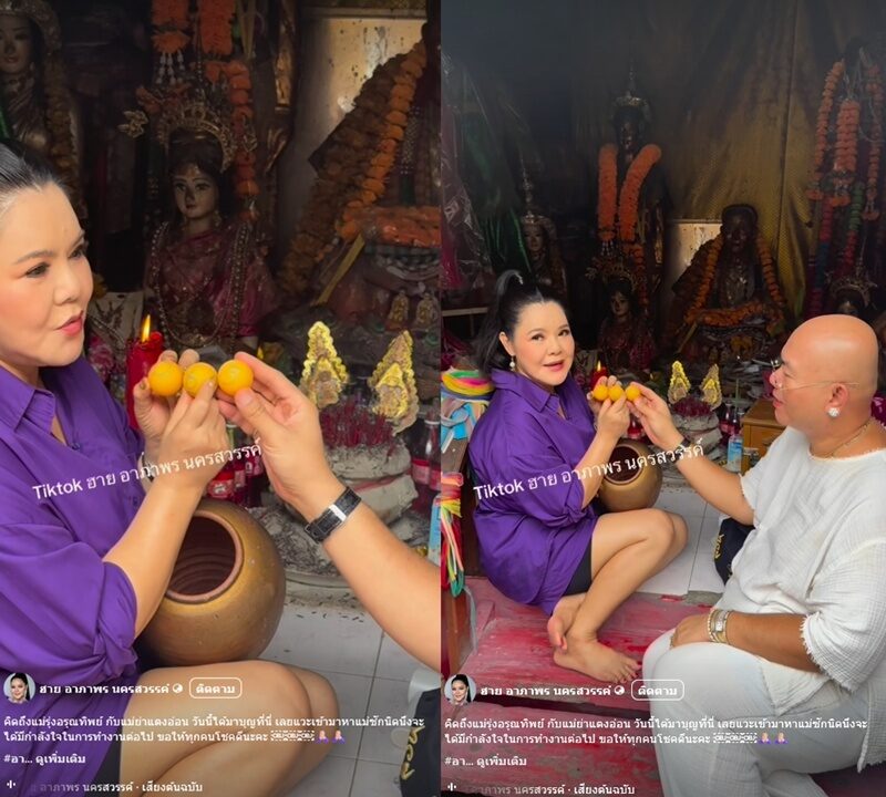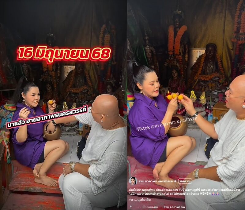 วันที่ 15 มิ.ย.68 ก่อนวันหวยออกวันนี้ (16 มิ.ย.68) ลูกทุ่งดังดวงเฮง ฮาย อาภาพร โพสต์คลิปแจกโชคแฟนหวย ขณะกลับไปไหว้ขอโชคแม่ตะเคียนยืนต้น ที่ศาลแม่รุ่งอรุณทิพย์ ศาลแม่ย่าตองอ่อน พร้อมแคปชั่นว่า
