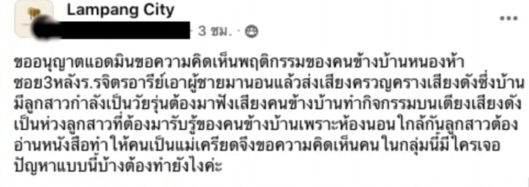 โดยผู้โพสต์ระบุว่า “ขออนุญาตแอดมินขอความคิดเห็นพฤติกรรมของคนข้างบ้านหนองห้า ซอย 3 หลัง รร.แห่งหนึ่ง เอาผู้ชายมานอนแล้วส่งเสียงครวญครางเสียงดัง ซึ่งบ้านมีลูกสาวกำลังเป็นวัยรุ่นต้องมาฟังเสียงคนข้างบ้านทำกิจกรรมบนเตียงเสียงดัง เป็นห่วงลูกสาวที่ต้องมารับรู้ของคนข้างบ้าน เพราะห้องนอนใกล้กัน ลูกสาวต้องอ่านหนังสือ ทำให้คนเป็นแม่เครียด จึงขอความคิดเห็นคนในกลุ่มนี้มีใครเจอปัญหาแบบนี้บ้าง ต้องทำยังไงคะ” พร้อมแนบรูปถ่ายป้ายซอยดังกล่าวมาด้วย