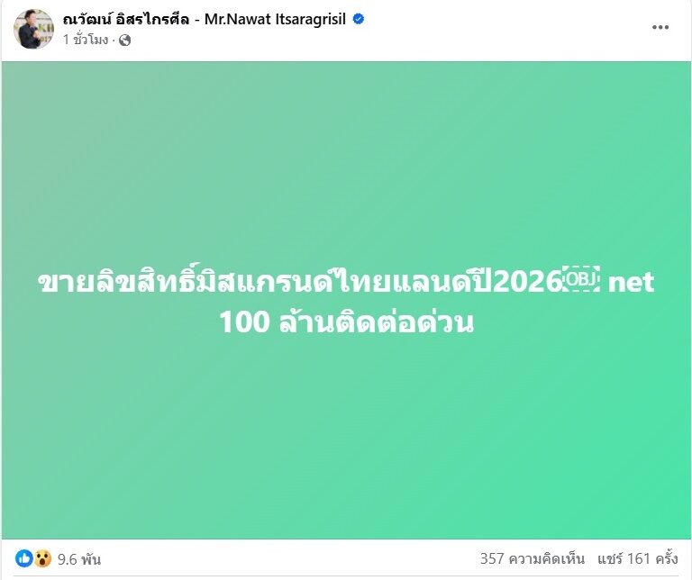 “ขายลิขสิทธิ์มิสแกรนด์ไทยแลนด์ปี2026 net 100 ล้านติดต่อด่วน” งานนี้มีทั้งคนสนใจและแฟนๆเข้ามาแซว อาทิ