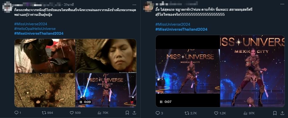 สวนทางกับเพจ Miss Universe Thailand ที่ได้ลงคลิปวิดีโอและรูปภาพ ตัดตอนที่ โอปอล พระแสงของ้าวที่ถือหักลง และชฎาที่สวมก็หลุดร่วงหล่นลงมาที่พื้น ออกไป จากนั้นก็ได้ลบโพสต์ดังกล่าว ก่อนโพสต์ใหม่แบบไม่ตัด