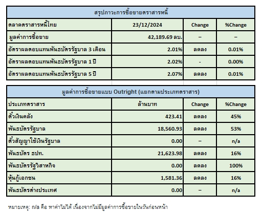 ด้านปัจจัยต่างประเทศกระทรวงพาณิชย์สหรัฐฯ รายงานดัชนีราคาการใช้จ่ายเพื่อการบริโภคส่วนบุคคลทั่วไป (Headline PCE) ปรับตัวขึ้น 2.4% ในเดือนพ.ย. (YoY) ต่ำกว่าที่นักวิเคราะห์คาดการณ์ที่ระดับ 2.5% จากระดับ 2.3% ในเดือนต.ค. ขณะที่สำนักงานสถิติแห่งชาติอังกฤษ (ONS) รายงานผลิตภัณฑ์มวลรวมภายในประเทศ (GDP)ของอังกฤษไม่ขยายตัวในไตรมาส 3/2567 ซึ่งเป็นการปรับลดการประเมินจากที่ประมาณการในเบื้องต้นว่า GDP ไตรมาส 3 ขยายตัว 0.1% ทั้งนี้ตลาดติดตามรายงานการประชุมธนาคารกลางญี่ปุ่น (BOJ) ในวันพรุ่งนี้