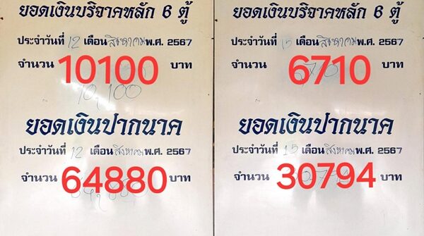 ส่วนยอดเงินปากนาค ในวันแม่ที่ผ่านมามียอด 64,880 บาท และอีกยอดของวันที่ 15 สิงหาคม ก่อนวันหวยออกจำนวนเงิน 6 ตู้บริจาค จำนวนเงิน 6,710 บาท ส่วนยอดเงินปากนาคจำนวนเงิน 30,794 บาทในวันหวยออก