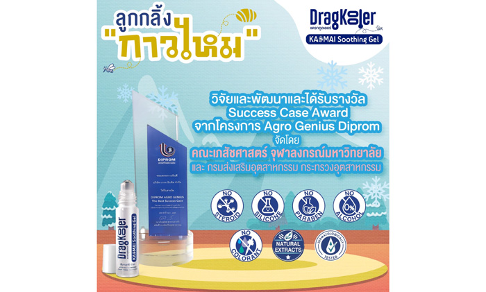 ผลิตภัณฑ์ “DRAGKOOLER ลูกกลิ้งกาวไหม” เป็นผลิตภัณฑ์นวัตกรรมภายใต้แบรนด์ DRAGKOOLER ที่ต่อยอดจากความสำเร็จจาก “ผ้าเปียกสมุนไพรสำหรับเช็ดตัวลดไข้” โดยใช้เวลาในการวิจัยและพัฒนากว่า 6 เดือน กระทั่งได้รับรางวัล Success Case Award จากโครงการ Agro Genius Diprom ภายใต้คณะเภสัชศาสตร์ จุฬาลงกรณ์มหาวิทยาลัย และ กรมส่งเสริมอุตสาหกรรม กระทรวงอุตสาหกรรม มาพร้อมสโลแกน “เย็น..หยุดคัน ทาหลังยุงกัด” ด้วยส่วนผสมหลักจากสาร Sericin ที่สกัดจากโปรตีนกาวไหม ที่กระตุ้นการสร้างคอลลาเจนและซ่อมแซมเซลล์ผิว ลดรอยดำ รวมถึงสารสกัดธรรมชาติ อาทิ ขมิ้นชัน, ใบบัวบก, โรดิโอลา และว่านหางจระเข้ ที่ทำหน้าที่ลดอาการคัน ลดรอยบวมแดง อย่างมีประสิทธิภาพ ตอบโจทย์ทุกปัญหาการแพ้ยุงใช้ได้ทั้งเด็กและผู้ใหญ่ เหมาะสำหรับทุกคนในครอบครัว อีกหนึ่งไอเทมจาก DRAGKOOLER ที่ต้องมีติดตัวตลอดเวลา