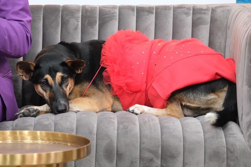 ตอนแรกจับเขาใส่ชุดยากไหม? บูม : “อันนี้ไม่ยาก เพราะเขาชอบอะไรที่สวยๆ งามๆ อยู่แล้ว เพราะก่อนหน้านี้บูมมีเดินแบบการกุศลช่วยหมาจร คือเริ่มต้นหนูใส่ให้หมูทะก่อน แล้วทีนี้มาลองให้เป๊ปซี่ใส่ดูด้วย สุดท้ายคือเขาชอบทั้งคู่ แต่ชอบในที่นี้ต้องบอกก่อนนะว่าบูมไม่ได้ให้น้องใส่แบบพะรุงพะรัง ใส่เป็นช่วงเวลา ไม่ได้ใส่ทั้งวัน”