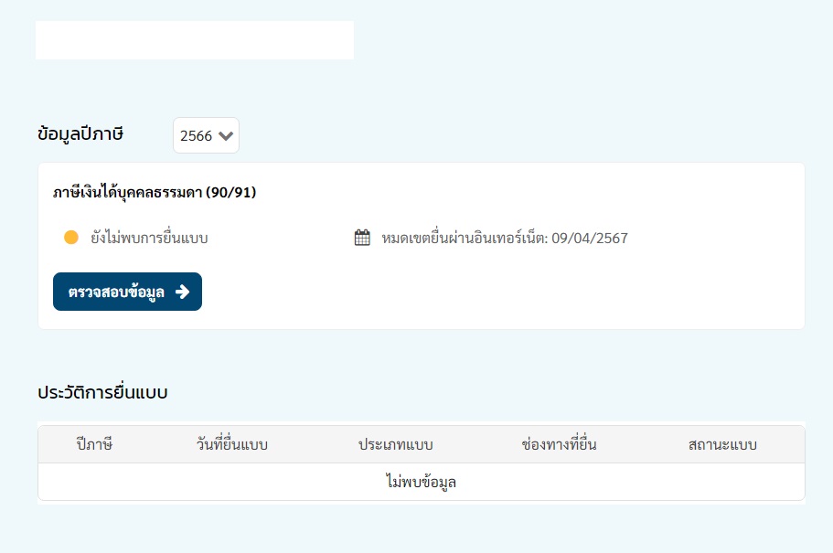 5. ระบบจะแสดงหน้าจอประวัติการยื่นแบบ (ภ.ง.ด.90/91) 3 ปีภาษี (รวมปีภาษีปัจจุบัน) หลังจากนั้นให้กด “ตรวจสอบข้อมูล”