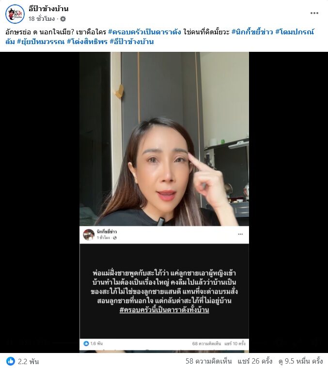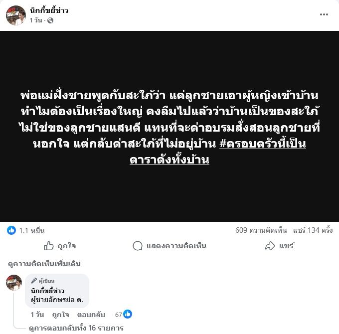“พ่อแม่ฝั่งชายพูดกับสะใภ้ว่า แค่ลูกชายเอาผู้หญิงเข้าบ้านทำไมต้องเป็นเรื่องใหญ่ คงลืมไปแล้วว่าบ้านเป็นของสะใภ้ไม่ใช่ของลูกชายแสนดี แทนที่จะด่าอบรมสั่งสอนลูกชายที่นอกใจ แต่กลับด่าสะใภ้ที่ไม่อยู่บ้าน #ครอบครัวนี้เป็นดาราดังทั้งบ้าน”