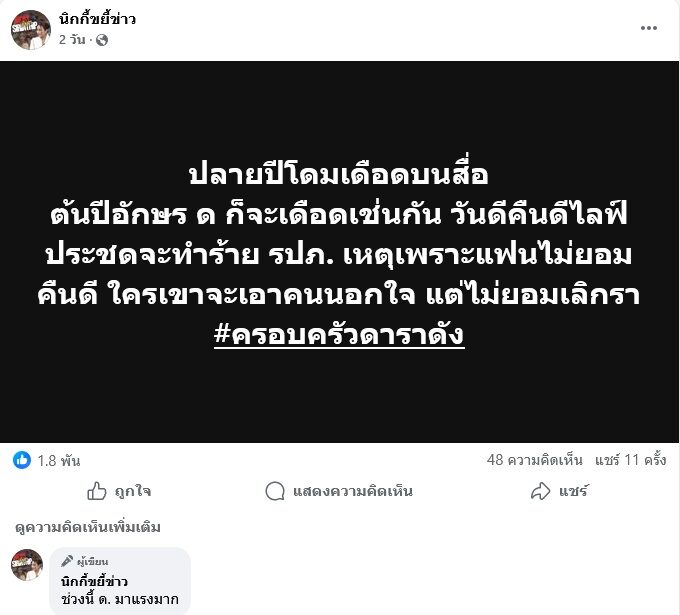 วงการบันเทิงไม่ได้พักจริงๆ มีเรื่องราวให้ใส่ใจอีก หลังจาก เพจ นิกกี้ขยี้ข่าว โพสต์ปริศนาข้อความว่า “ปลายปีโดมเดือดบนสื่อ ต้นปีอักษร ด ก็จะเดือดเช่นกัน วันดีคืนดีไลฟ์ประชดจะทำร้าย รปภ. เหตุเพราะแฟนไม่ยอมคืนดี ใครเขาจะเอาคนนอกใจ แต่ไม่ยอมเลิกรา #ครอบครัวดาราดัง”