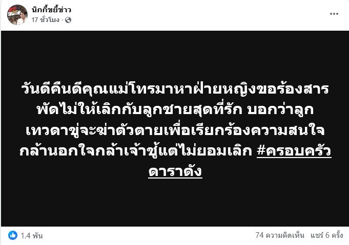 “วันดีคืนดีคุณแม่โทรมาหาฝ่ายหญิงขอร้องสารพัดไม่ให้เลิกกับลูกชายสุดที่รัก บอกว่าลูกเทวดาขู่จะฆ่าตัวตายเพื่อเรียกร้องความสนใจ กล้านอกใจกล้าเจ้าชู้แต่ไม่ยอมเลิก #ครอบครัวดาราดัง”