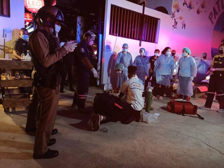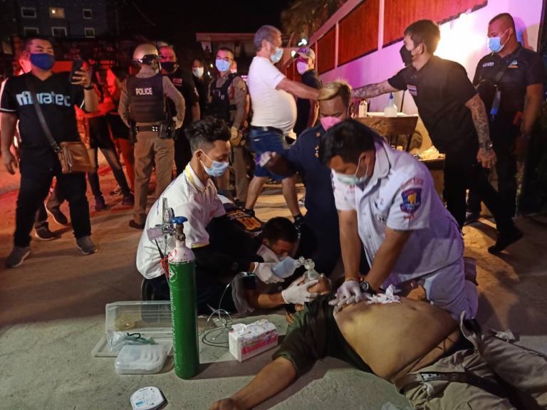 สอบถามทีมตรวจหาเชื้อโควิด-19 ทราบว่า ขณะที่กำลังตรวจหาผู้ติดเชื้ออยู่ด้านหน้าสถานบันเทิงพัทยาบีช นั้น พบเห็นกลุ่มชายฉกรรจ์ ไล่ตีกันมา 7-8 คน ท่ามกลางนักท่องเที่ยวจำนวนมาก แต่ผู้บาดเจ็บวิ่งหนีตายกระทั่งพลาดท่าล้ม ทำให้กลุ่มคู่อริไล่ตามมาเตะเข้าที่ใลหน้า กระทืบซ้ำ แล้วใช้ของมีคมแทงปักเข้าที่หน้าอก จนนอนแน่นิ่งไป หลังเกิดเหตุก็พากันวิ่งหลบหนีหายไปอย่างรวดเร็ว