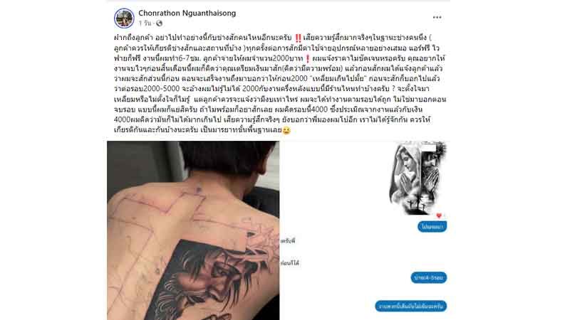 อ่านข่าวต้นฉบับได้ที่ : เปิดใจช่างสัก เจอลูกค้าเหลี่ยมจัด สักไปครึ่งหลัง ขอจ่ายแค่ 2,000 บาท