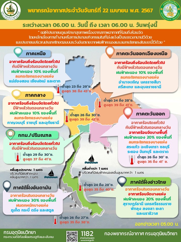 วันที่ 22 เมษายน 2567 กรมอุตุนิยมวิทยา พยากรณ์อากาศ 24 ชั่วโมงข้างหน้า ความกดอากาศต่ำเนื่องจากความร้อนปกคลุมประเทศไทยตอนบน ลักษณะเช่นนี้ทำให้ประเทศไทยมีอากาศร้อนถึงร้อนจัดโดยทั่วไปกับมีฟ้าหลัวในตอนกลางวัน ขอให้ประชาชนดูแลรักษาสุขภาพ เนื่องจากสภาพอากาศที่ร้อนถึงร้อนจัด โดยหลีกเลี่ยงการทำงานหรือการประกอบกิจกรรมในที่โล่งแจ้งเป็นระยะเวลานานไว้ด้วย