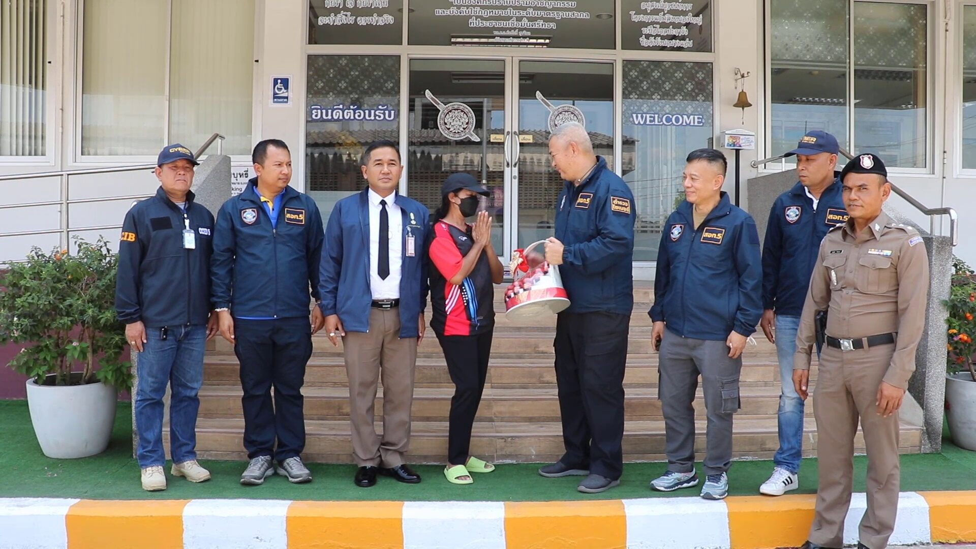 มีหญิงวัย 50 ปี ขี่รถจักรยานยนต์พร้อมด้วยกระเช้าของขวัญ 1 กระเช้ามามอบให้กับ พล.ต.ต.ภูมิพัฒน์ ภัทรศรีวงษ์ชัย โดยมีพ.ต.อ.ปัญญา ท้วมศรี ผกก.สภ.เมืองชุมพร ร่วมรับมอบด้วย