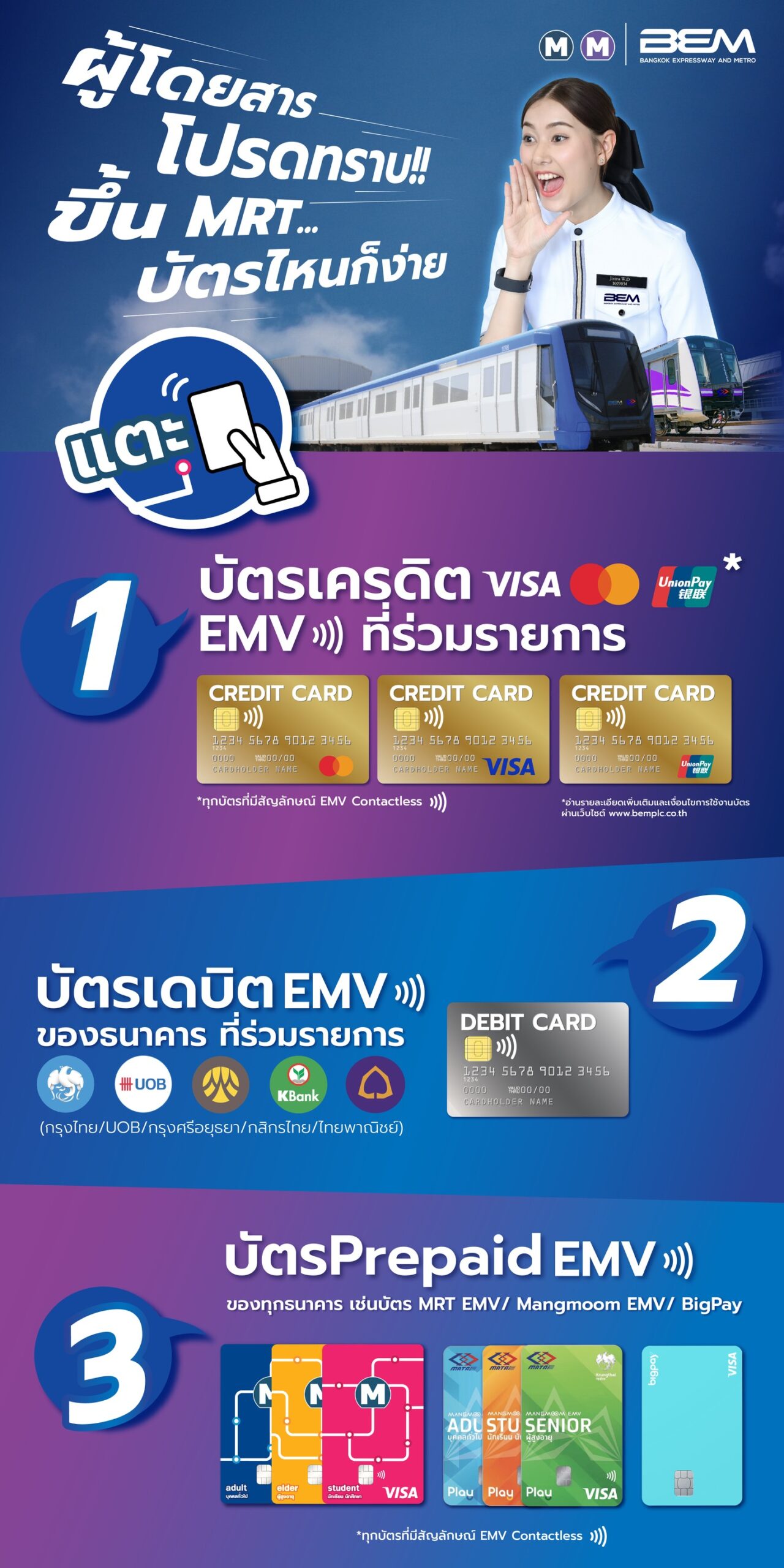 โดยเราตั้งใจที่จะผลักดันให้บัตรมาตรฐาน EMV Contactless เป็นคำตอบที่ดีที่สุดของระบบตั๋วร่วม ทั้งต่อประชาชนชาวไทย รวมถึงนักท่องเที่ยวชาวต่างชาติที่มีบัตรเครดิต VISA/MasterCard/UnionPay อยู่แล้ว เมื่อเดินทางเข้าสู่กรุงเทพฯ ก็สามารถเข้าถึงบริการรถไฟฟ้า MRT ได้โดยสะดวกยิ่งขึ้น