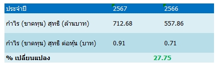 นอกจากนี้ บริษัทฯ มีกำไรสำหรับปี 67 รวมทั้งสิ้น 712.70 ล้านบาท คิดเป็นอัตรากำไรสุทธิร้อยละ 15.20 ของรายได้รวม ซึ่งเพิ่มขึ้นร้อยละ 27.80 จากกำไรสุทธิ 557.90 ล้านบาทในปี 66 ซึ่งมีอัตรากำไรสุทธิอยู่ที่ร้อยละ 13.10 ของรายได้รวม การเติบโตดังกล่าวสะท้อนถึงประสิทธิภาพในการดำเนินงานของบริษัทฯ ตลอดจนความสามารถในการบริหารจัดการต้นทุนและรายได้อย่างมีประสิทธิภาพ