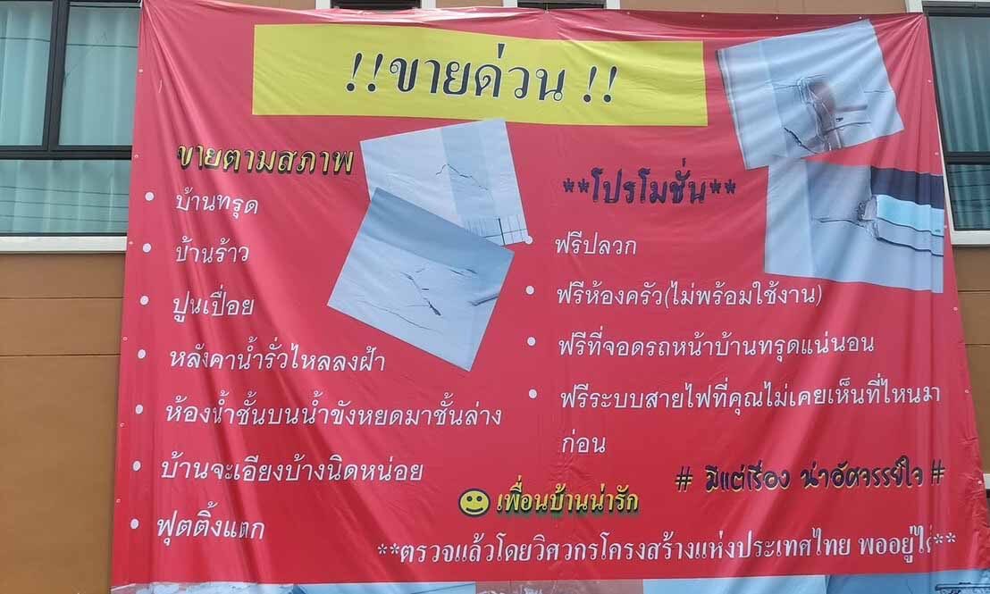 จากกรณีผู้ใช้ติ๊กต็อกรายหนึ่ง เผยแพร่คลิปวิดีโอที่แสดงให้เห็นการติดป้ายประกาศขายบ้านอย่างจริงใจหน้าบ้านของตนเอง โดยในป้ายได้ระบุถึงปัญหาต่างๆ ของตัวบ้านอย่างชัดเจน ทั้งเรื่องโครงสร้างและการซ่อมแซม พร้อมระบุว่า ไม่ได้ต้องการปิดบังใดๆกับผู้ที่สนใจจะซื้อ ซึ่งไม่ใช่มีเพียงบ้านของเจ้าของคลิปเท่านั้น แต่ยังมีบ้านอีกหลายหลังในโครงการเดียวกันที่ติดป้ายลักษณะเดียวกันทั่วทั้งหมู่บ้าน