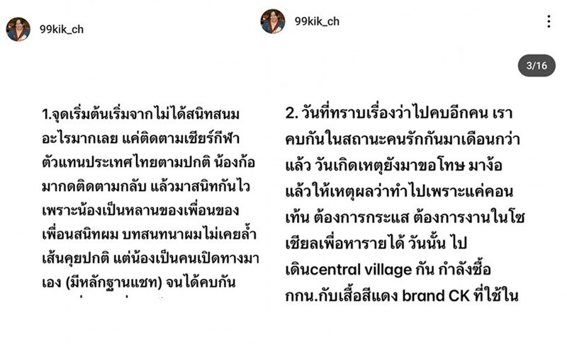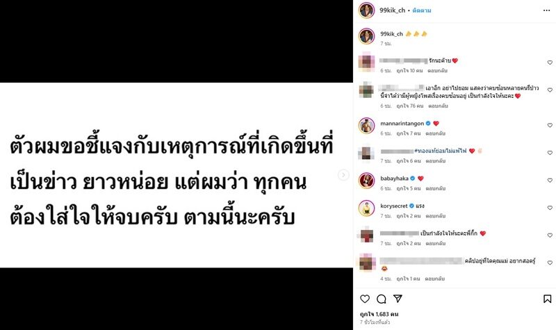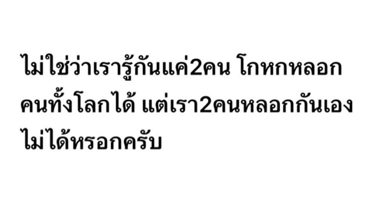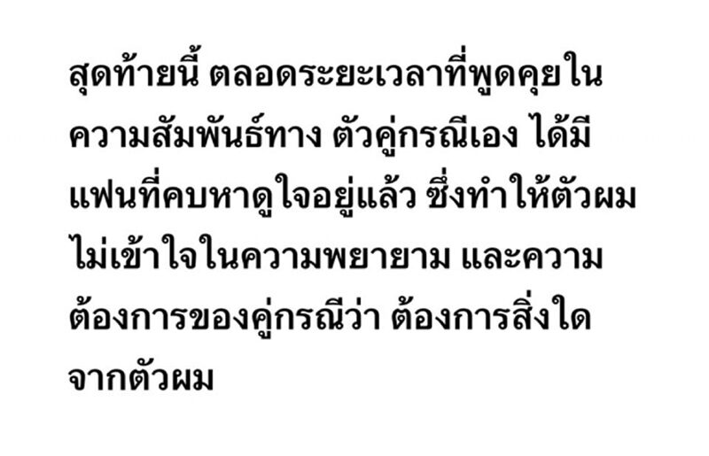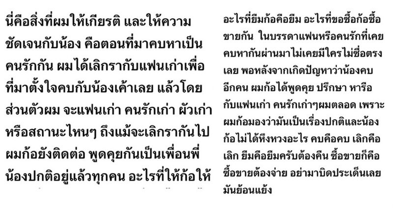 ทั้งยังชี้แจงตอนคบหาเป็นคนรักกัน ตัวเองได้ให้เกียรติให้ความชัดเจน โดยเลิกรากับแฟนเก่า คนรักเก่าไปแล้ว ก่อนปิดท้ายด้วยข้อความว่า “ไม่ใช่ว่าเรารู้กันแค่2คน โกหกหลอกคนทั้งโลกได้ แต่เรา2คนหลอกกันเองไม่ได้หรอกครับ”