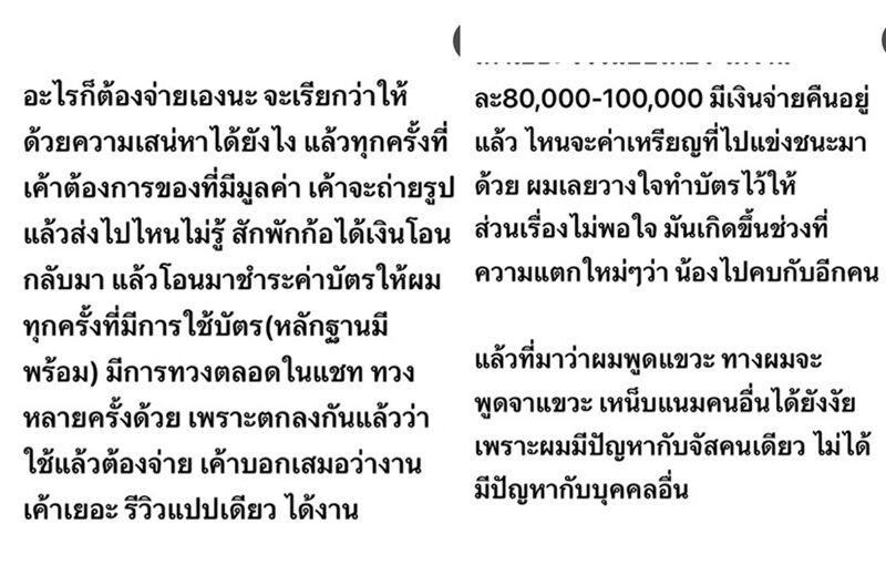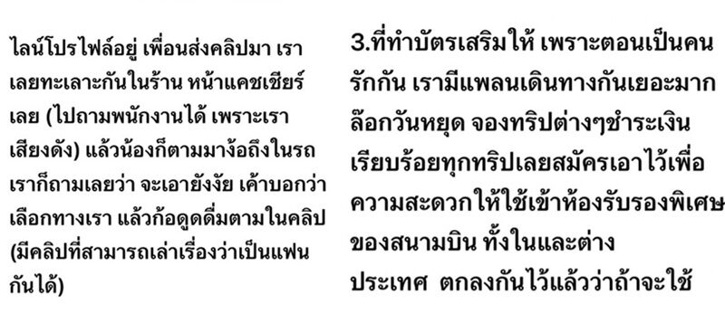 เรื่องเงิน ทำบัตรเสริมให้ ตกลงกันถ้าใช้บัตร ต้องจ่ายเอง เมื่อต้องการของมีมูลค่า เขาจะถ่ายรูปส่งไปไหนไม่รู้ สักพักก็ได้รับเงินโอนกลับมาชำระค่าบัตรให้ ทุกครั้งที่มีการใช้บัตร มีการทวงตลอด มีหลักฐานแชท เพราะตกลงกันแล้วต้องจ่าย เรื่องไม่พอใจเกิดขึ้นช่วงที่ความแตก น้องไปคบกับอีกคน เริ่มไม่จ่ายเงินคืน