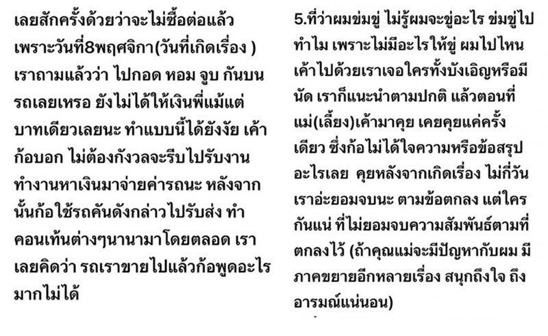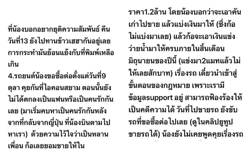 เรื่องรถก็ยืนยันน้องขอซื้อตั้งแต่ 9 ตุลาคม ตอนยังไม่ได้ตกลงเป็นแฟนเลย จะนำเข้าสู่ขั้นตอนกฎหมาย เพราะมีข้อมูลฟ้องร้องได้ เพราะน้องยังใช้รถคันนี้ ขับไปทำงาน รับส่งของ ไปทำคอนเทนต์ต่างๆ
