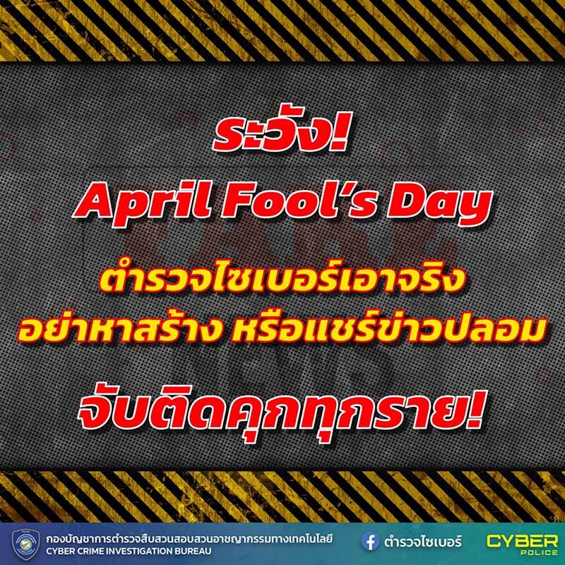 วันที่ 31 มี.ค. 2568 ตำรวจไซเบอร์ บช.สอท. ได้โพสต์แจ้งเตือนระบุว่า พรุ่งนี้ April Fool's Day !ตำรวจไซเบอร์เอาจริง อย่าหาสร้างหรือแชร์ข่าวปลอมไม่คิด จับติดคุกทุกราย !