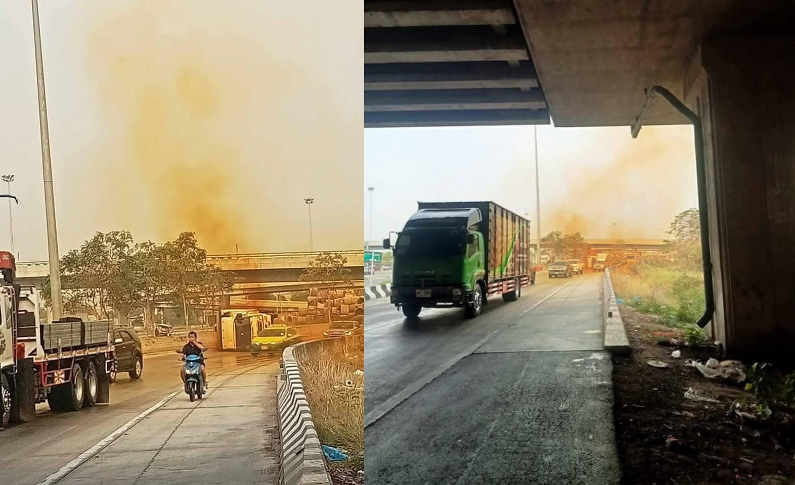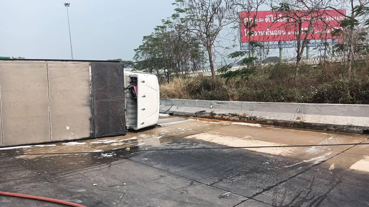 รถบรรทุกสารเคมีพลิกคว่ำ มีควันสีส้มกระจายฟุ้งเต็มถนน พบมีกลิ่นฉุนทะลุเข้ารถผ่านไปมา