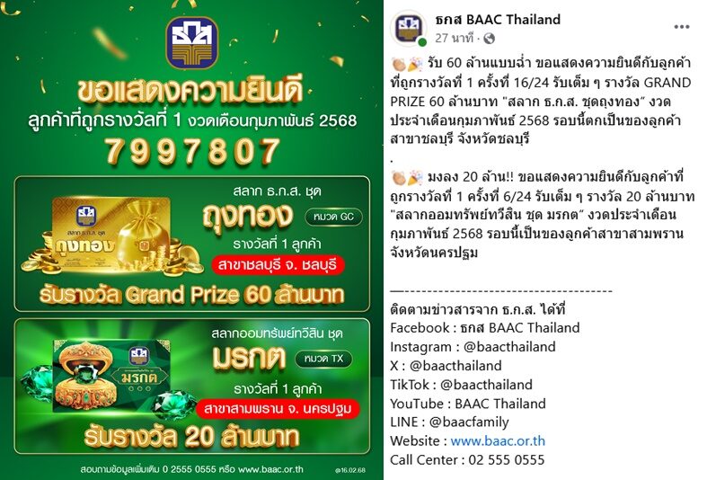 “รับ 60 ล้านแบบฉ่ำ ขอแสดงความยินดีกับลูกค้าที่ถูกรางวัลที่ 1 ครั้งที่ 16/24 รับเต็ม ๆ รางวัล GRAND PRIZE 60 ล้านบาท "สลาก ธ.ก.ส. ชุดถุงทอง” งวดประจำเดือนกุมภาพันธ์ 2568 รอบนี้ตกเป็นของลูกค้าสาขาชลบุรี จังหวัดชลบุรี”