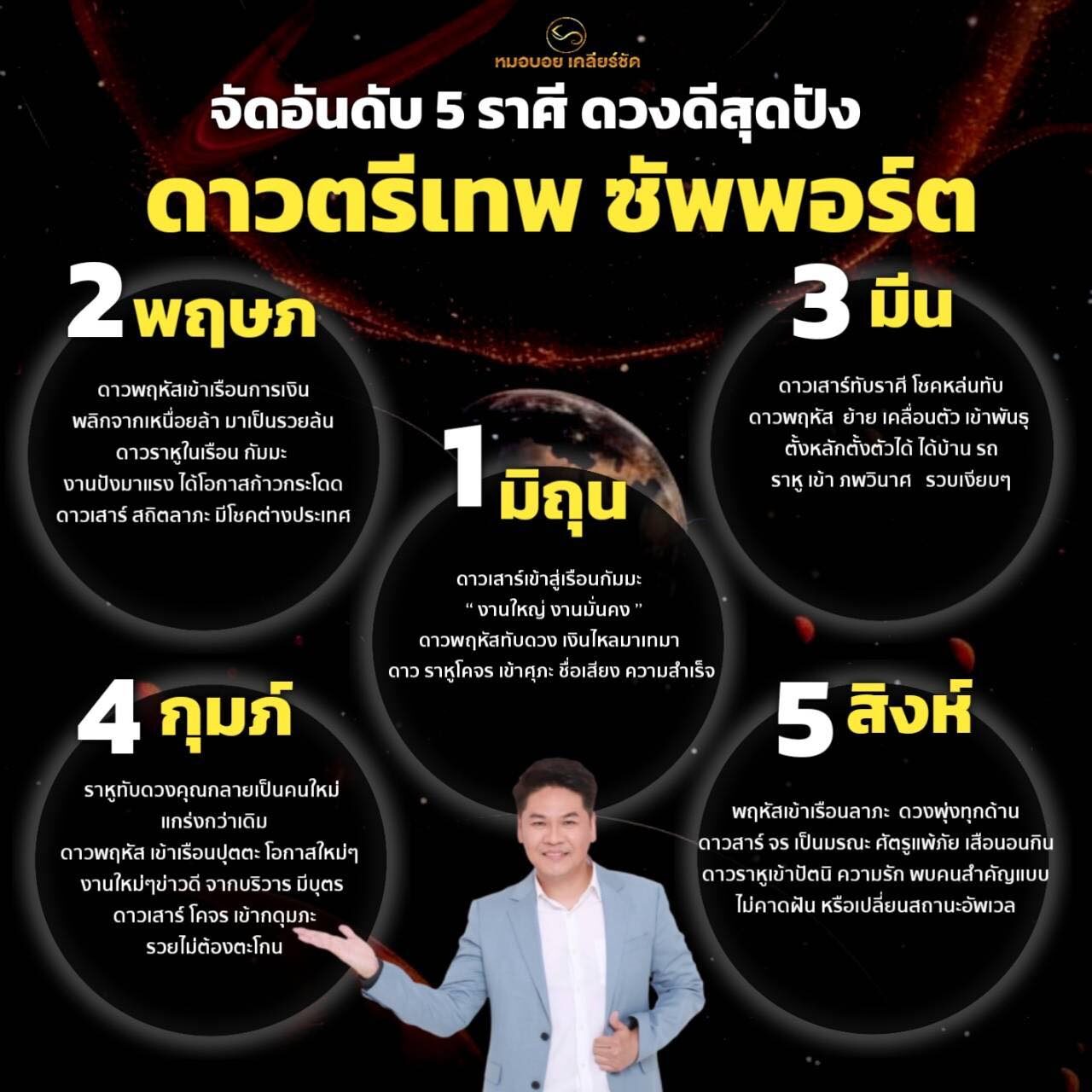 หมอบอย เคลียร์ชัด เผยถึง 5 อันดับราศี ดวงดีสุดปัง ดาวตรีเทพซัพพอร์ต ดาวเสาร์เข้าสู่เรือนกัมมะ งานใหญ่ งานมั่นคง ดาวพฤหัสทับดวง เงินไหลมาเทมา ดาวราหูโคจร เข้าศุภะ ชื่อเสียงความสำเร็จ