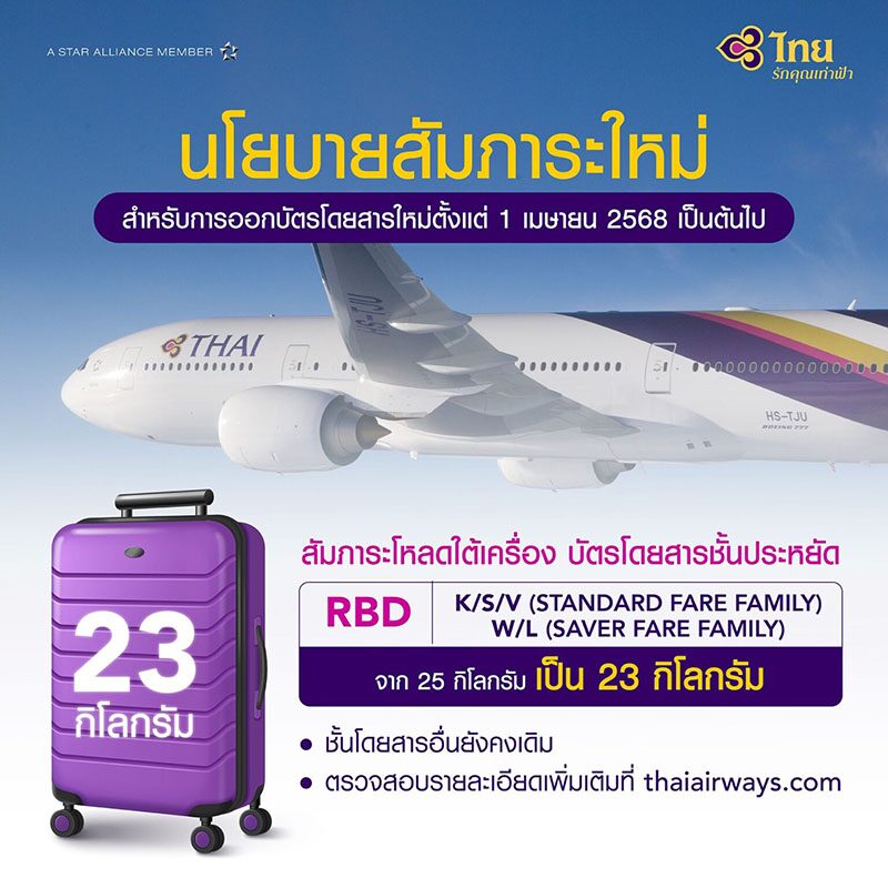 การบินไทย ประกาศลดน้ำหนักกระเป๋า ชั้นประหยัดบางประเภท โหลดใต้เครื่อง จาก 25 กก. เหลือ 23 กก. ตั้งแต่ 1 เม.ย. 2568 เป็นต้นไป